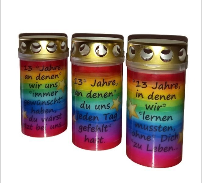 Unsere Sternenkinder vermissen wir jeden Tag, aber es gibt so viele besondere Tage, an denen sie uns fehlen. Der Todestag ist einer davon. Wir haben diese Grabkerzen in Regenbogenfarben entworfen.